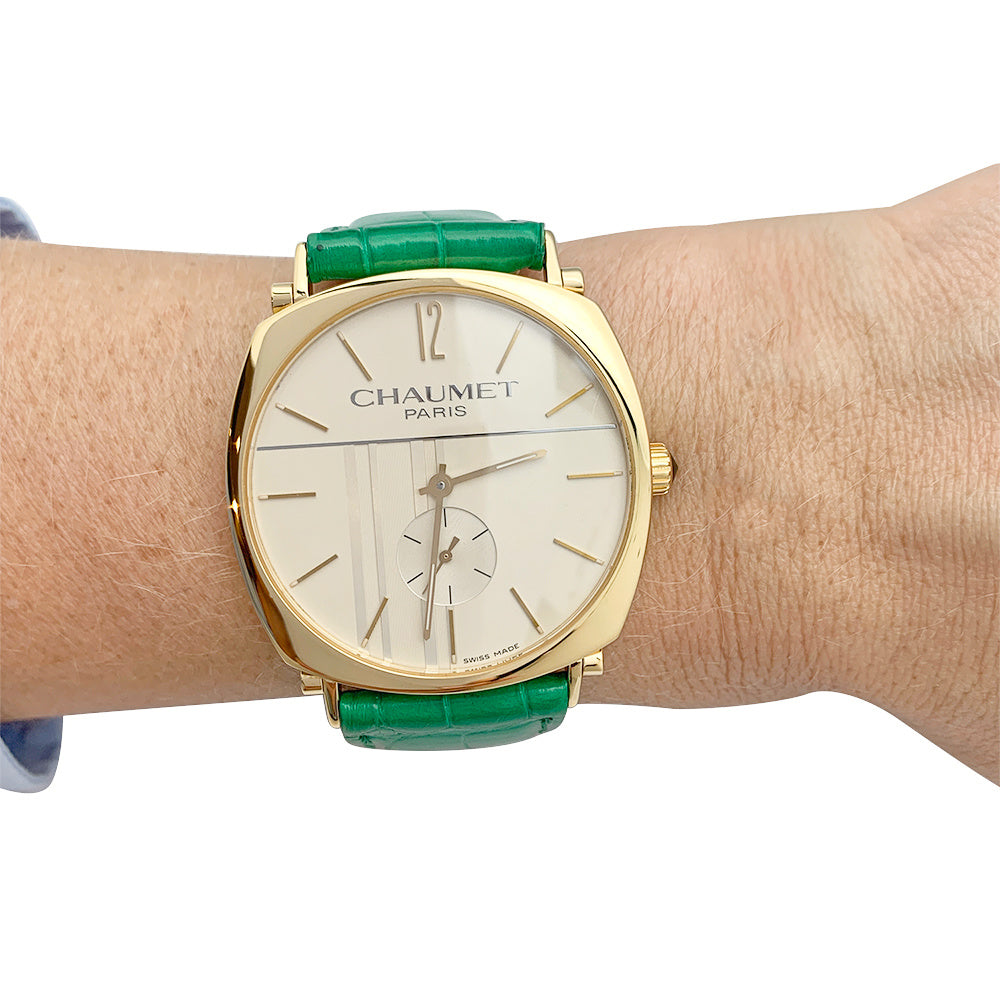Montre Chaumet, "Dandy" en or jaune sur cuir.